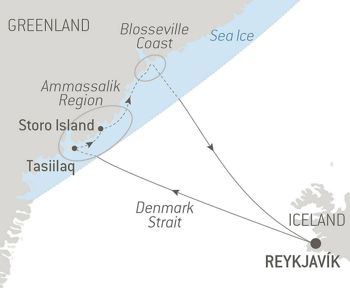 Still relatively unknown just a century ago, the east coast of Greenland remains the most authentic and majestic region in the Arctic. Explore this part of the world where the alpine mountains merge intimately with the sea and the fjords are adorned with high, snow-capped peaks and icebergs drifting or trapped in the pack ice. You will slowly immerse yourself in the heart of frozen landscapes of surreal beauty. The infinite variety of textures in the different types of ice creates an ever-changing scenery. Follow in the wake of the famous Pourquoi Pas?, the ship of Captain Jean-Baptiste Charcot who set off with his crew in 1934 to land Paul-Émile Victor in Ammassalik. A small island of primitive and wild beauty, for his first ethnographic mission, during which he would study the Ammassalimiut, a little-known Inuit community. In this deceptively frozen landscape, the silence is broken only by the sounds of dogs and the grating of sled runners against the ice. You will receive a warm welcome in villages still protected by the fast ice. You will have the opportunity to discover the Inuit culture’s ancestral traditions during joyous and authentic moments shared with the communities.