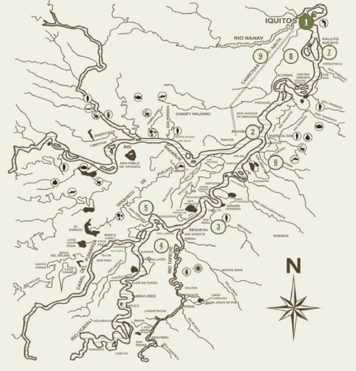 After your flight to the capital of the Peruvian Amazon, our guides will meet you at the Iquitos airport—waiting for you with a sign with the name of Jungle Experiences. We will then go to the Doubletree by Hilton Iquitos Hotel, the meeting point, to receive your first briefing about the trip and where you will enjoy a delicious welcome lunch. Then you will be transported by a private vehicle to the main dock of the city of Iquitos to board El Zafiro, your home for the following three nights. While El Zafiro begins its initial navigation, you can enjoy the most fantastic panoramic views from the observation area that is elegantly equipped for your enjoyment and located on our third deck. Enjoy the fantastic panoramic view from our elegant indoor and outdoor lounge that is also located on the third deck. Our bartender will be waiting for you to serve you an exotic cocktail prepared with fruits from the region and pisco, the national liquor of Peru. Before the welcome dinner, your naturalist guides will give you an overview of the travel program, activities, routes, important moments, wildlife and vegetation, the geographical and historical background, and other useful details. After dinner, we invite you to the third deck where you can a spectacular view of the stars as we enter the depths of the Amazon rainforest, or relax with live music by our band on board and enjoy a varied repertoire of Amazonian, national, and international music.