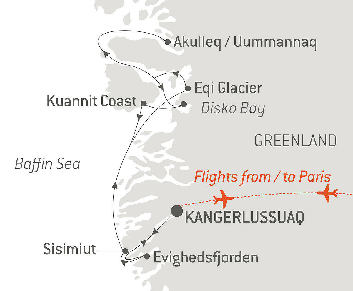 This itinerary is your chance to embark on an 8-day expedition cruise to Greenland. In Kangerlussuaq, aboard Le Boréal, you will embark for an unforgettable journey in the heart of the most magnificent Arctic landscapes.